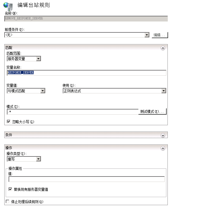2)圖形建立規(guī)則,進入IIS點開URL重寫,新建出站規(guī)則 規(guī)則名稱:自定義,匹配:服務器變量,變量名稱:RESPONSE_SERVER,模式:.*,其它默認,應用即可。 如下圖: